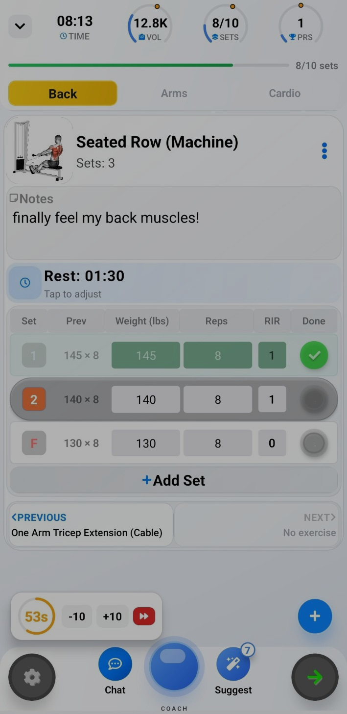 Log workouts quickly, use built-in timers and exercise guidance, and let the AI refine sets, reps, and weight as you improve.