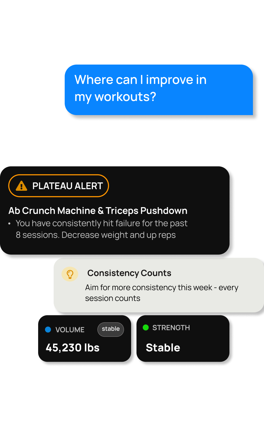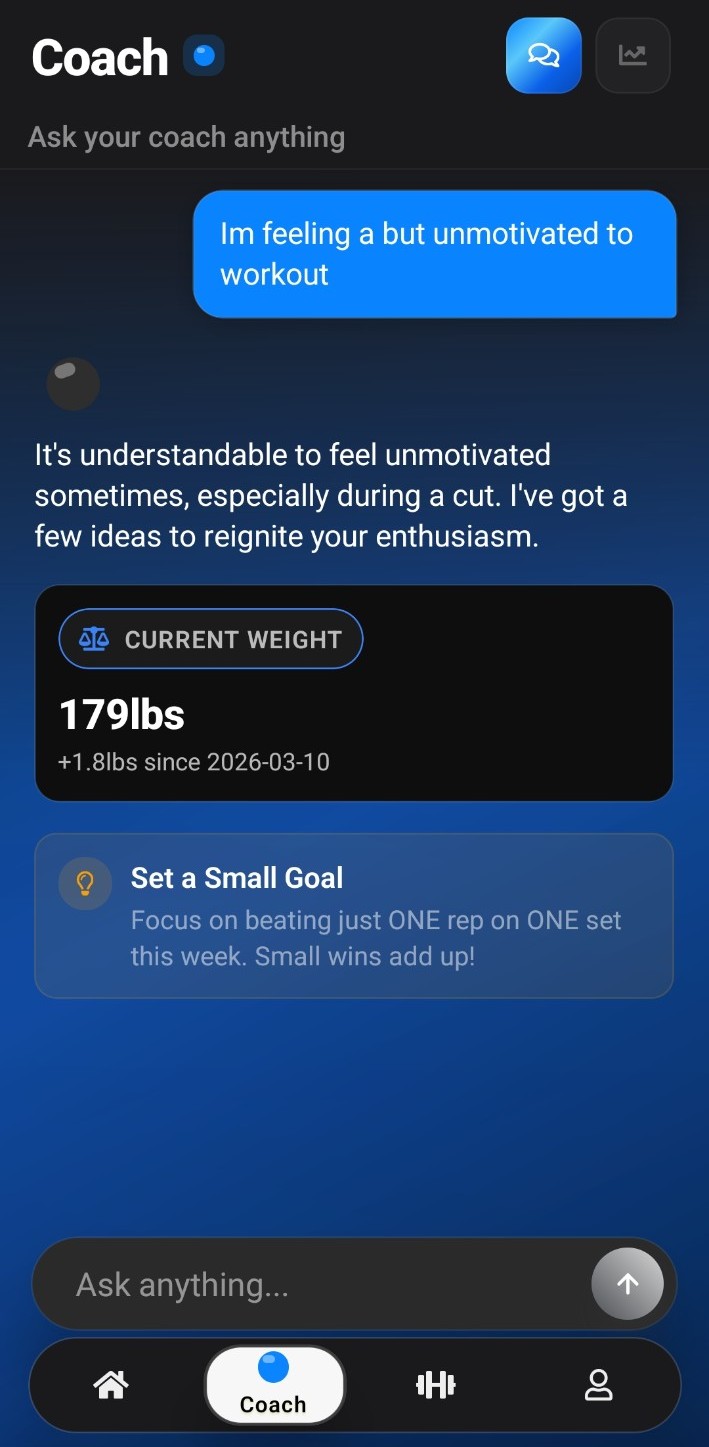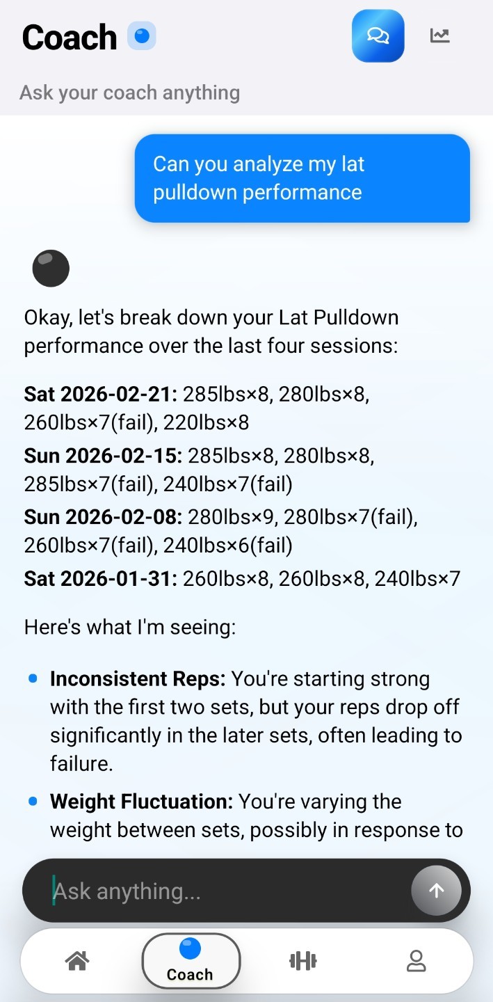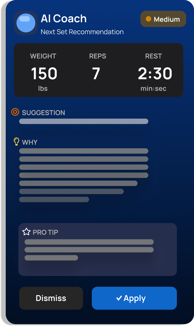 Your personal AI strength coach. Break plateaus with dynamically adapting workout plans, auto-regulated volume, and real-time recovery tracking.